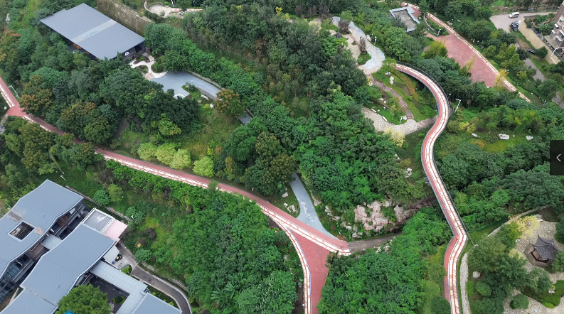 以生态智慧破解山体高差难题的高新区山体公园系列,维护面积约5.86万㎡,构建起完整的植物景观系统。项目用立体廊桥与彩虹桥串联商住空间与山体,打造独特的立体广场;将透光混凝土墙、盐井天车等元素融入盐、恐龙等自贡地域文化符号,让本土文化在生态空间中自然呈现;无障碍云廊的创新设计,实现轮椅直达观景台,彰显全龄友好理念。项目不仅修复了山体碎片化的生态问题,更打破了传统公园与城市的物理隔离,成为“城园共生”的典范,大幅提升了南湖生态城的宜居度与城市品质。