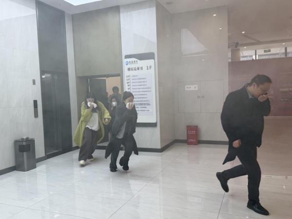 上午10时50分,随着模拟烟雾升起,应急疏散演练正式拉开帷幕。消防警报骤响,各楼层安全员迅速就位,引导大家弯腰低姿、捂住口鼻,沿安全通道快速撤离。全体员工反应迅速,行动有序,在短时间内全部安全疏散至大楼前广场集合点。