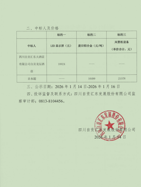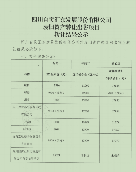 四川自贡汇东发展股份有限公司 废旧资产转让出售项目 转让结果公示