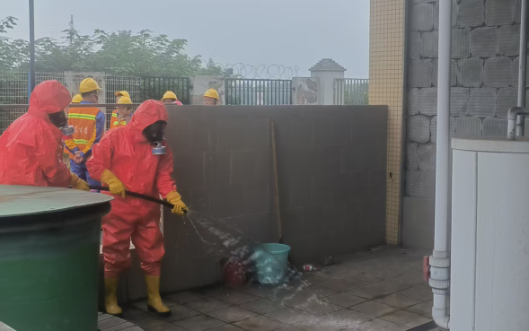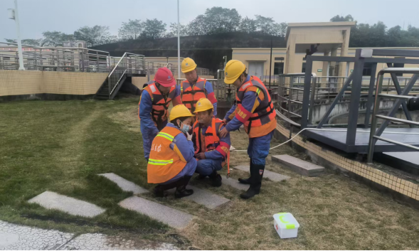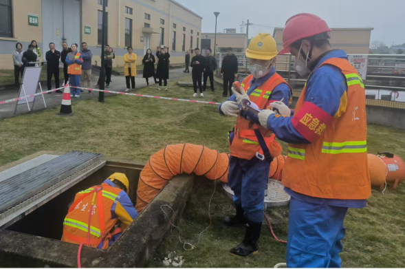 以“演”促防,锤炼应急真本领。演练于下午三点正式启动,各场景处置紧张有序、科学规范:综合库房火灾处置中,巡查人员及时上报,经断电、灭火器初期灭火、消防水枪强化处置,最终确认无复燃隐患;二沉池溺水救援时,监护人员快速抛投救生圈、关闭吸泥机电源,救援人员借助救生装备成功解救落水人员并送医检查;加药间次氯酸钠溶液泄漏后,应急处置人员穿戴防护装备入现场排查泄漏点、维修处理,通过沙土围堵吸附、清水稀释等方式妥善处置,稀释水样经检测合格后收集排至厂区污水处理系统;污泥管路阀门井有限空间作业严格执行“先通风、再检测、后作业”要求,完成风险辨识、方案审批、安全交底、现场监测等全流程规范操作。整场演练历时约1小时,各应急小组反应迅速、配合默契,处置流程环环相扣,达到了预期效果。